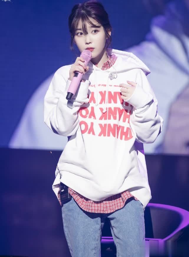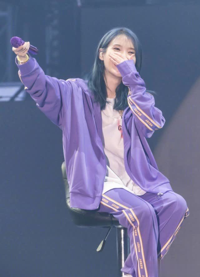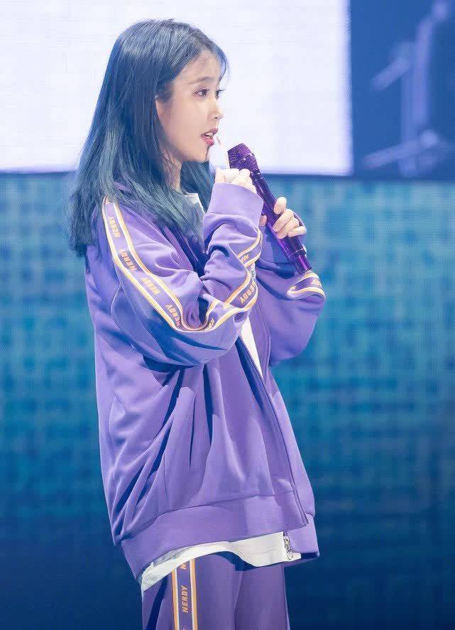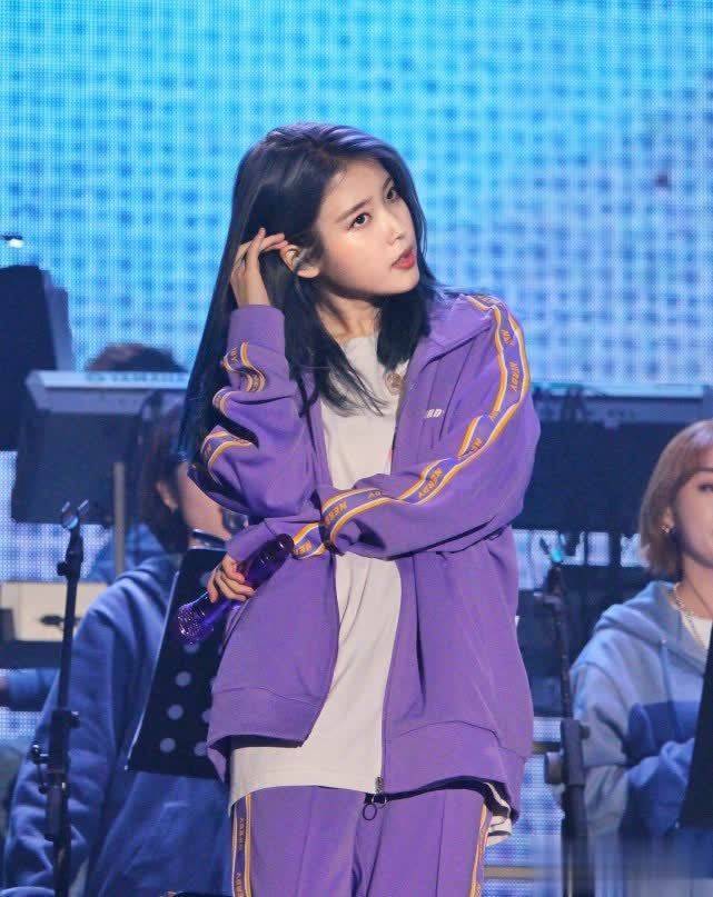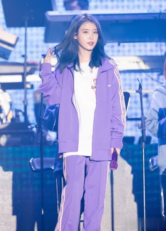 这是IU在舞台上唱歌的造型,是不是看着特别普通、随性啊?一件白T恤搭配紫色运动服,满满的运动气息,有一种慵懒的感觉。